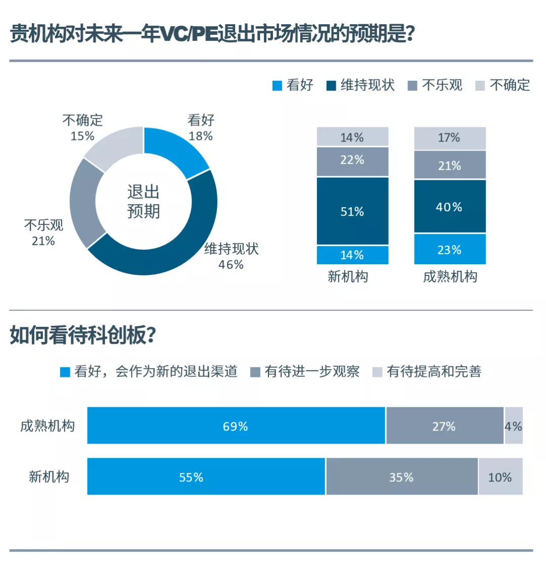對2020年中國股權投資市場退出端“看好”和認為“維持現狀”的機構共占到所有調研的64%。其中,看好退出環境的成熟機構多于新機構;與此同時,成熟機構也更看好科創板,兩者具有一定相關性。反映出成熟機構退出壓力加大,十分渴望國內退出市場建設改革 。