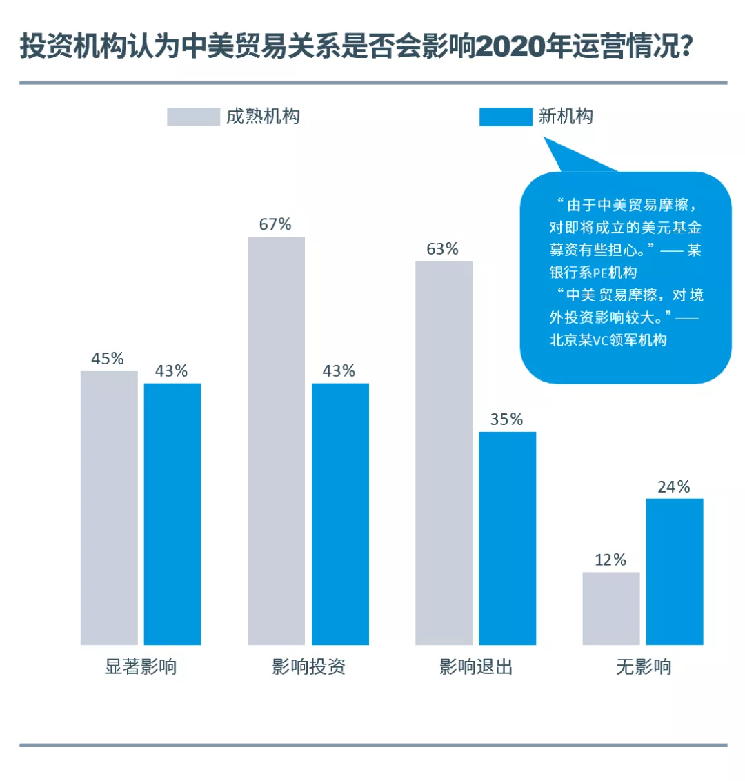 對于中美貿易關系對于2020年機構運營的影響,成熟投資機構與新投資機構的擔憂程度略有差異。成熟機構對“貿易摩擦影響投資/退出”的擔憂更明顯,而新機構認為“無影響”的比例更大。