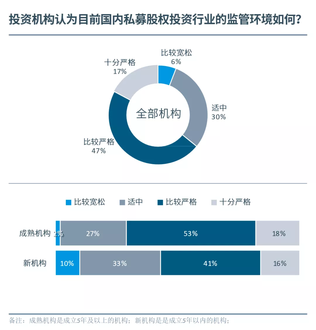 64%投資機構認為國內當前私募股權投資行業監管嚴格(含“比較嚴格”和“十分嚴格”)。成熟機構認為“監管嚴格”的比例遠高于新機構,主要原因可能是2014年以來中國創新經濟加速發展,市場層出不窮的模式和現象倒逼管理層加碼監管,致使當下的監管環境與成熟機構前期經歷的“相對寬松”環境出現明顯反差。
