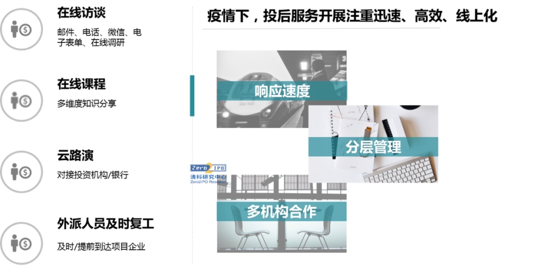 在嚴(yán)格的物理隔離之下,機(jī)構(gòu)投后服務(wù)開展注重高效化、線上化。通過在線訪談、電子表單等形式收集被投企業(yè)信息;通過線上課程解答眾多創(chuàng)業(yè)企業(yè)需要面對(duì)的共性問題;原本線下進(jìn)行的資源對(duì)接會(huì)、路演也轉(zhuǎn)為了“云路演”,為企業(yè)高效對(duì)接資源。針對(duì)有外派人員的并購(gòu)類、工程類項(xiàng)目,外派人員及時(shí)甚至提前到崗,加快企業(yè)安全復(fù)工復(fù)產(chǎn)。