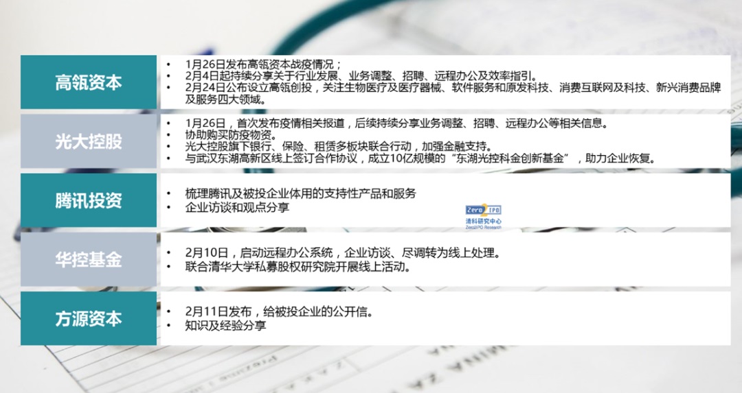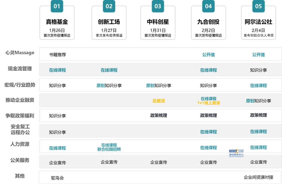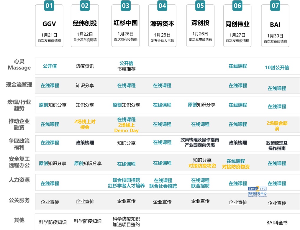 VC機(jī)構(gòu)是投后服務(wù)體系較為健全的一類。面對(duì)突發(fā)狀況,VC機(jī)構(gòu)投后服務(wù)啟動(dòng)迅速,例如1月26日,紅杉中國(guó)即發(fā)布了《紅杉中國(guó)給成員企業(yè)的一封信》,發(fā)出對(duì)被投企業(yè)的三個(gè)提醒。紅杉、源碼資本、GGV等機(jī)構(gòu)均迅速開展了系列課程,涵蓋遠(yuǎn)程辦公協(xié)作、勞動(dòng)法規(guī)培訓(xùn)、疫情時(shí)期的融資策略、疫情期間的財(cái)務(wù)風(fēng)險(xiǎn)管理以及疫情時(shí)期的人力資源優(yōu)化等方面。紅杉、經(jīng)緯、BAI率先嘗試了線上路演形式;紅杉、深創(chuàng)投、源碼資本幫助企業(yè)解決春招難題。