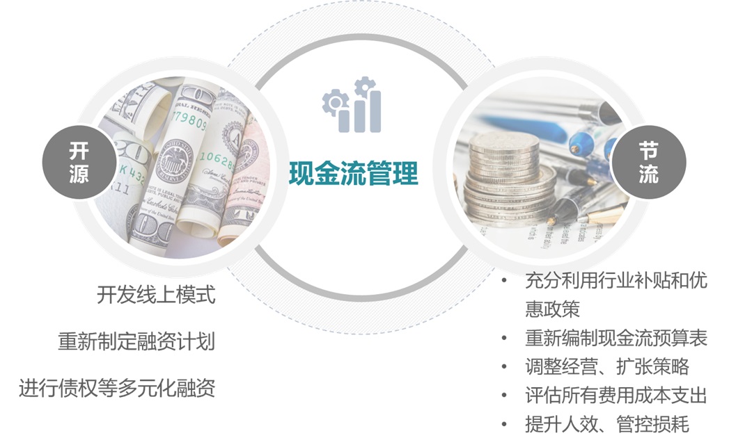 疫情之下,企業(yè)現(xiàn)金流出現(xiàn)危機(jī),“開源節(jié)流”、“留足12個(gè)月運(yùn)營(yíng)資金”的呼聲不絕于耳。“開源”方面,鼓勵(lì)企業(yè)跳出原有運(yùn)營(yíng)模式,評(píng)估打造線上產(chǎn)品的可能性,同時(shí)重新制定融資計(jì)劃,全面了解“股權(quán)”和“債權(quán)”融資方式,調(diào)整估值預(yù)期。“節(jié)流”方面,充分利用行業(yè)補(bǔ)貼和優(yōu)惠政策,例如延遲繳納社保等,及時(shí)調(diào)整經(jīng)營(yíng)策略,降低擴(kuò)張速度和補(bǔ)貼力度,編制未來一年現(xiàn)金流預(yù)期表,及時(shí)處理應(yīng)收應(yīng)付,評(píng)估銷售、薪酬、房租等費(fèi)用項(xiàng)目,制定合理降本計(jì)劃。