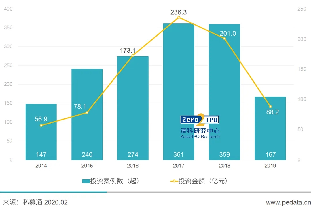根據(jù)清科研究中心《2020年中國醫(yī)療器械行業(yè)投融資分析報(bào)告》,2014-2019年,中國醫(yī)療器械行業(yè)累計(jì)披露投資案例1548起,披露投資金額833.6億元。其中,2017年是中國醫(yī)療器械行業(yè)投資大爆發(fā)的一年,投資案例數(shù)、投資金額雙雙達(dá)到歷年峰值,其中披露投資案例361起,同比增長31.8%,投資金額達(dá)236.3億元,同比增長36.5%。2018年,隨著投資市場逐漸趨于理性,投資者在對投資標(biāo)的的選取上變得謹(jǐn)慎,更加傾向于投資真正具備技術(shù)壁壘的創(chuàng)新企業(yè)。受整體經(jīng)濟(jì)環(huán)境的影響,2019年中國醫(yī)療器械行業(yè)投資明顯下滑,披露投資案例數(shù)和投資金額分別同比下降了53.5%、56.1%。