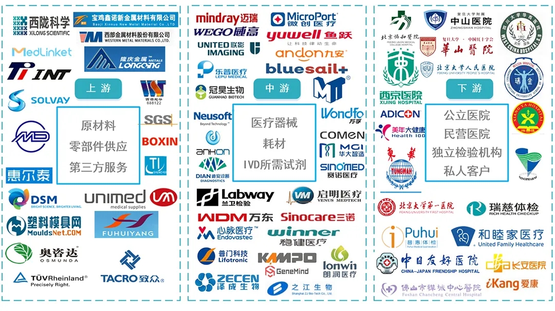 從醫(yī)療器械產(chǎn)業(yè)鏈來看:上游主要是醫(yī)療器械用原材料、零部件供應(yīng)、第三方服務(wù)等;中游主要是醫(yī)療器械、耗材、IVD所需試劑等;下游主要是各類醫(yī)療機(jī)構(gòu),包括公立醫(yī)院、中小型民營醫(yī)院、獨(dú)立檢驗(yàn)機(jī)構(gòu)、私人客戶等。