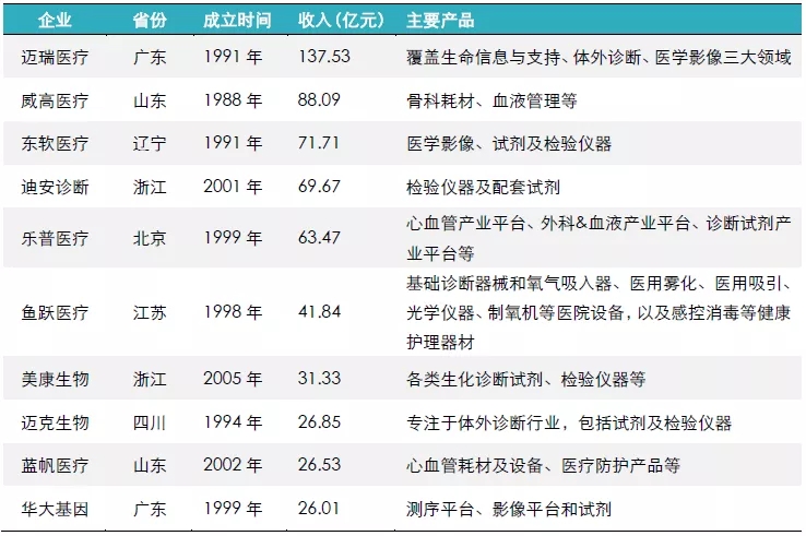 整體來看,中國發(fā)展活躍的醫(yī)療器械企業(yè)相對集中在東部沿海地區(qū),平均成立時(shí)間一般超過20年,主要產(chǎn)品集中在體外診斷制劑及檢驗(yàn)儀器、醫(yī)學(xué)影像等細(xì)分領(lǐng)域。根據(jù)公開數(shù)據(jù),2018年,中國醫(yī)療器械企業(yè)TOP10總營收為583億元人民幣,占2018年中國醫(yī)療器械市場規(guī)模的11%,遠(yuǎn)低于全球醫(yī)療器械市場44%的行業(yè)集中度。