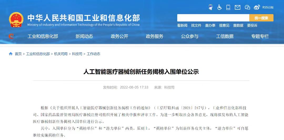 近日,國家工業和信息化部科技司、國家藥品監督管理局醫療器械注冊司對人工智能醫療器械創新任務揭榜入圍單位進行公示。